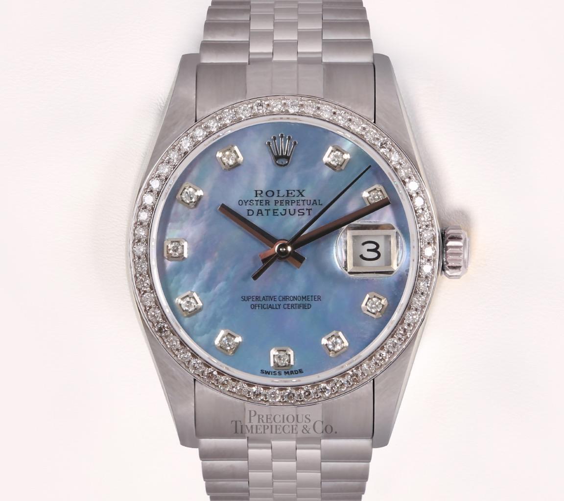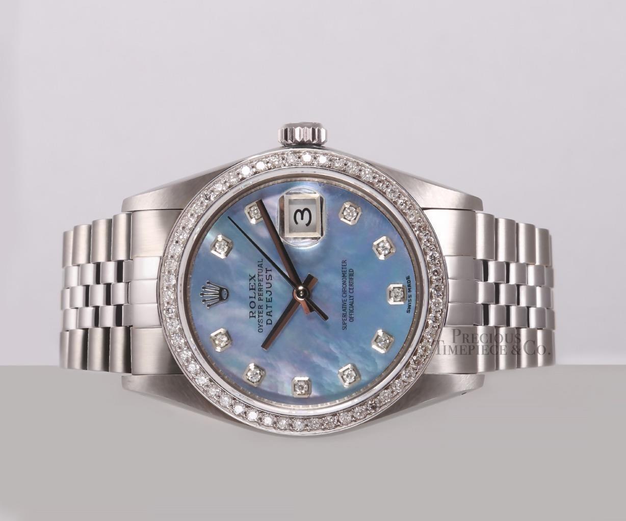 | DIAL | Custom Blue Mother of Pearl Dial with Diamond Hour Markers |